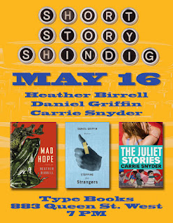 May 16 (Wednesday): Short Story Shindig at Type Books in Toronto! 7-9pm. I'm reading with Heather Birrell and Daniel Griffin, and our host for the evening is the most awesome Kerry Clare (who writes the best book blog on the block, Pickle Me This).